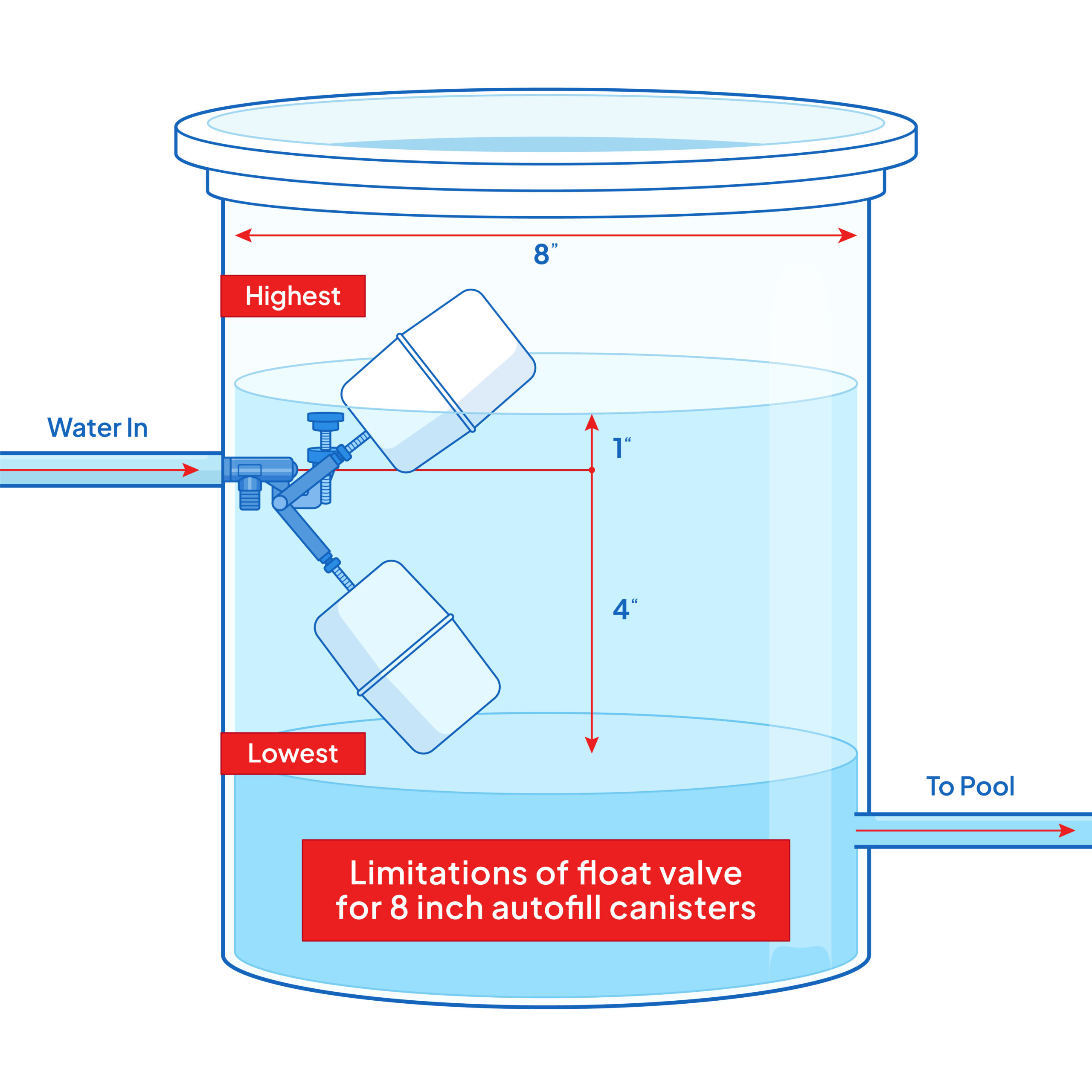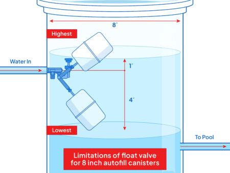 - ππ-ππππππ πππππ: This automatic waterΒ Level control float valve with easy adjustment fits seamlessly into in-ground pool with 8 inch autofill canister, maintaining efficient water level control without occupying excessive space.